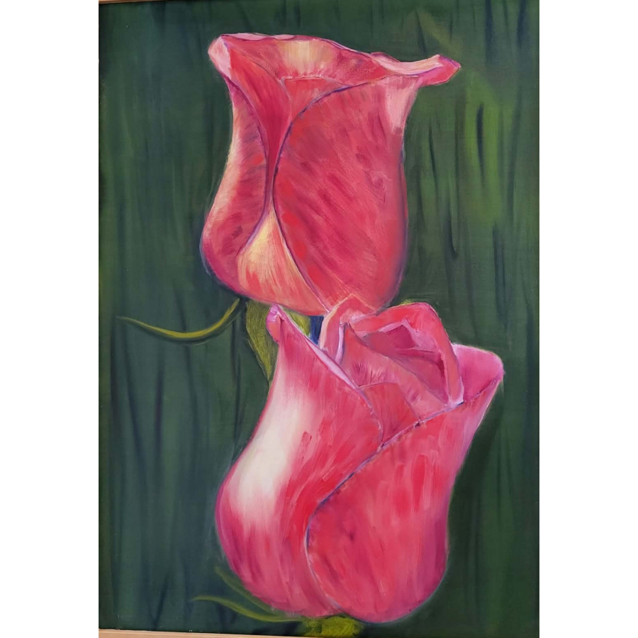 This oil painting on canvas portrays two red roses rising together against a deep green ground, their curved forms and layered brushwork suggesting closeness, balance, and shared presence. Subtle shifts in tone and line give the blossoms a sense of movement and individuality while maintaining a quiet harmony between them. Measuring 28.25 inches high by 20.5 inches wide, the piece is presented in a natural wood frame with a 1 1/2 inch face and depth, without mat or glass, offering a warm and organic finish.