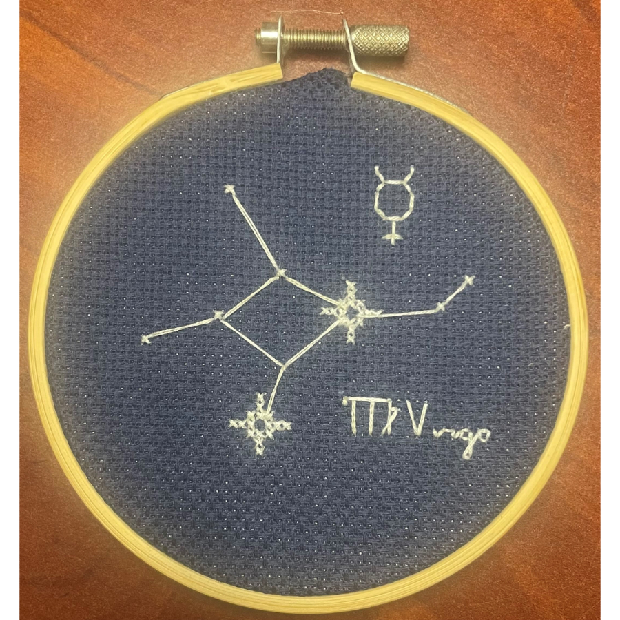 This 4-inch embroidery features the Virgo constellation delicately stitched in white DMC floss on a midnight navy Aida cloth, evoking a serene starry sky. The thoughtful design includes the Virgo name, glyph, and planetary symbol, lending a sense of harmony and quiet strength. Framed in a wooden hoop, it’s a refined, handcrafted tribute to detail, grace, and cosmic beauty.