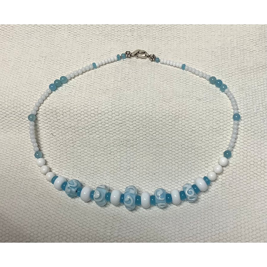 Lampwork beads, glass and semi-precious stone beads on 19 in. stainless steel cable. Sterling silver hook and loop clasp.