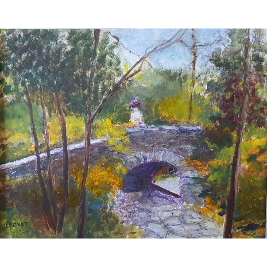 This oil on canvas painting depicts a tranquil stone bridge surrounded by trees touched with shifting seasonal color. A figure in the distance, dressed in white with a purple hat, adds a quiet sense of scale and narrative to the scene. Framed in wood with a gray stain and finished with a white insert, the piece measures 13.5 inches high by 16.75 inches wide, offering both intimacy and depth.